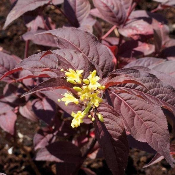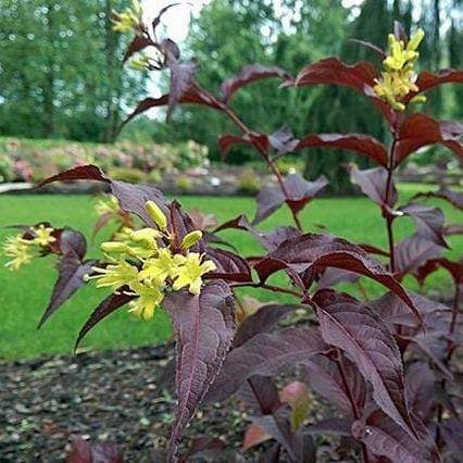 Diervilla Nightglow Shrubs or Diervilla splendens 'El Madrigal' are deciduous shrubs with dark red foliage and striking yellow blooms. Also known as Bush Honeysuckle, Diervilla Nightglow Shrubs' foliage turns an even deeper red during the fall. They are easy to care for and popular placements include walkways, patios, and cornerstones of landscapes.