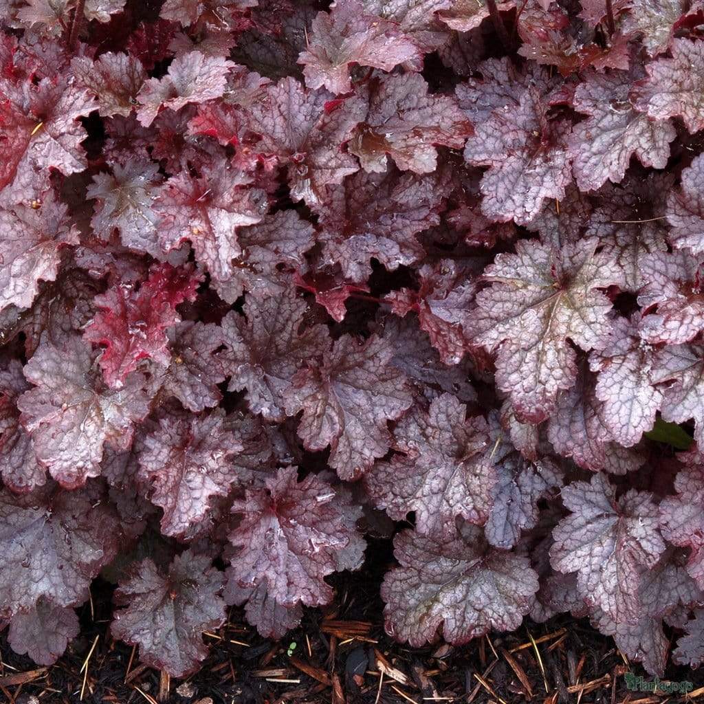 Heuchera Plum Pudding (Heuchera x 'Plum Pudding'), also known as Coral Bells, is a ground cover perennial with dramatic purple-plum colored foliage. In springtime, tiny white flowers emerge and depending on the sun exposure, the purple leaves show silver and golden variegation. Coral Bells is an evergreen perennial that is ideal for woodland gardens as it prefers partial shade but can tolerate full sun. Its tight, compact growth and low mounding habit makes it a versatile addition to your garden as well as a lovely choice for vase cuttings and floral bouquets. Heuchera Plum Pudding’s attractive heart-shaped leaves are deer and rabbit resistant and great for mass plantings.