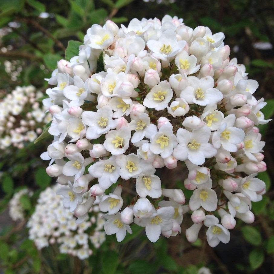 Koreanspice Viburnum Shrubs or Viburnum carlesii is a truly breathtaking shrub when in bloom, clothed in snowy white fragrant flowers. It has attractive horizontal branching and good fall color, making it a fantastic specimen shrub. Korean Spice Viburnum is draped in stunning white daphne-like flowers held atop the branches in mid-spring.
