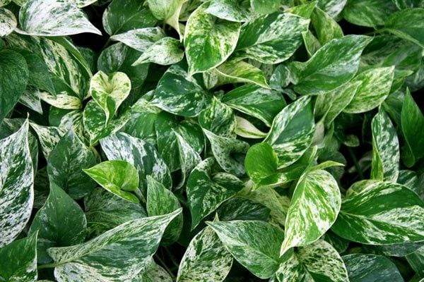 Marble Queen Pothos has a green and white tear-shaped foliage with a tendency to trail and cascade. Also known as Devils Ivy.