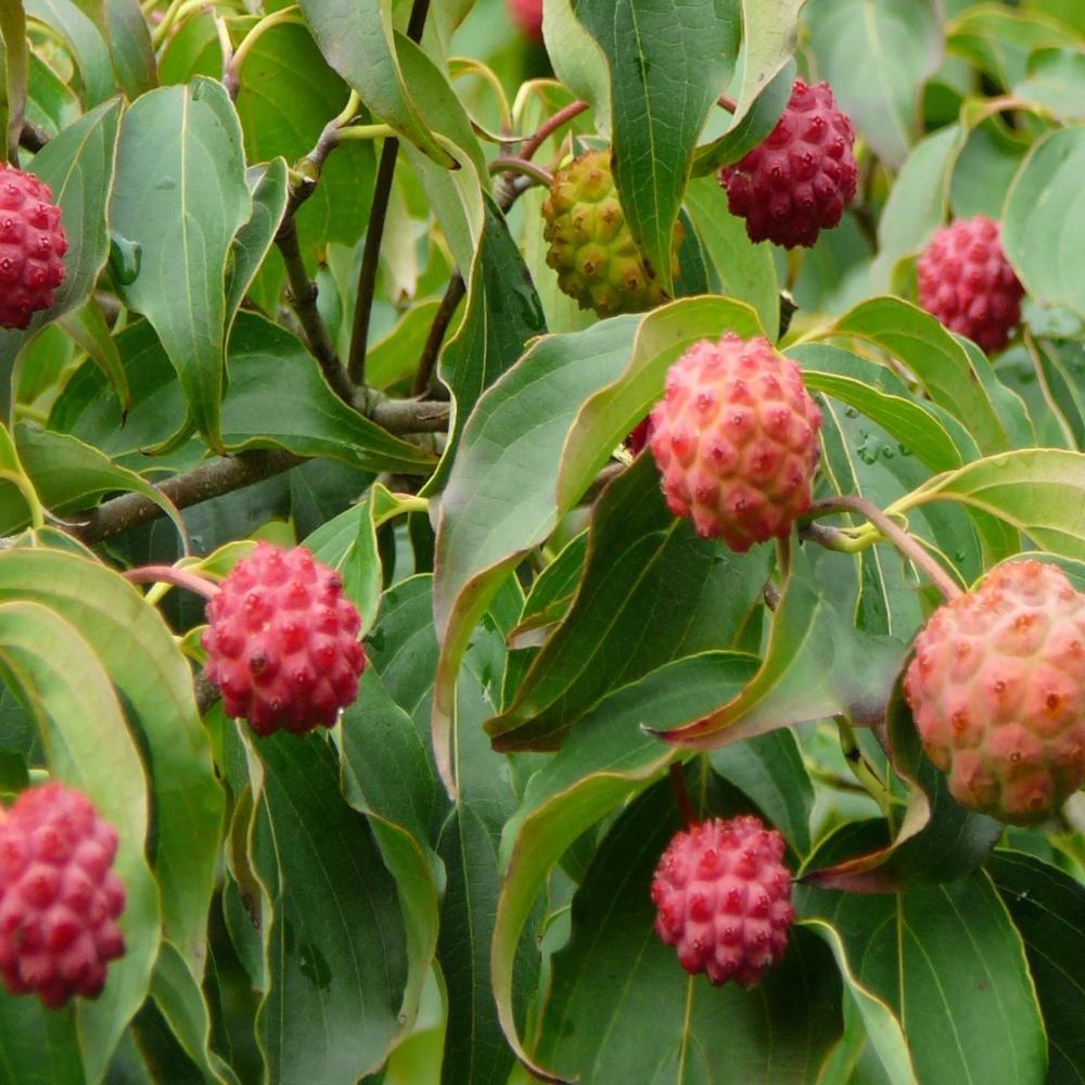 Milky Way Kousa Dogwood Tree is an upright, vase-shaped tree that develops strong horizontal branching with age. Huge, star-shaped, creamy white flowers bloom in early June, followed by raspberry-like fruits that will attract birds. Its deep green foliage turns purple-red in fall.