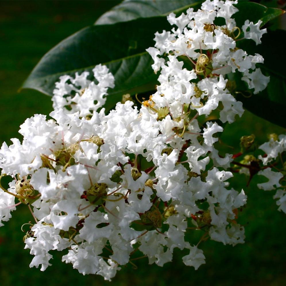 Famous for their extended bloom time, Natchez White Crape Myrtle Trees (Lagerstroemia indica x fauriei 'Natchez') blossom pure white flower clusters in June that can last up to 5 months before they fall away in the fall. At this time the dark green glossy leaves turn orange and red that fit beautifully in with the autumn colors. When this deciduous tree sheds its leaves, all that is left is the smooth, dark cinnamon-brown bark that brings the tree year-round interest.