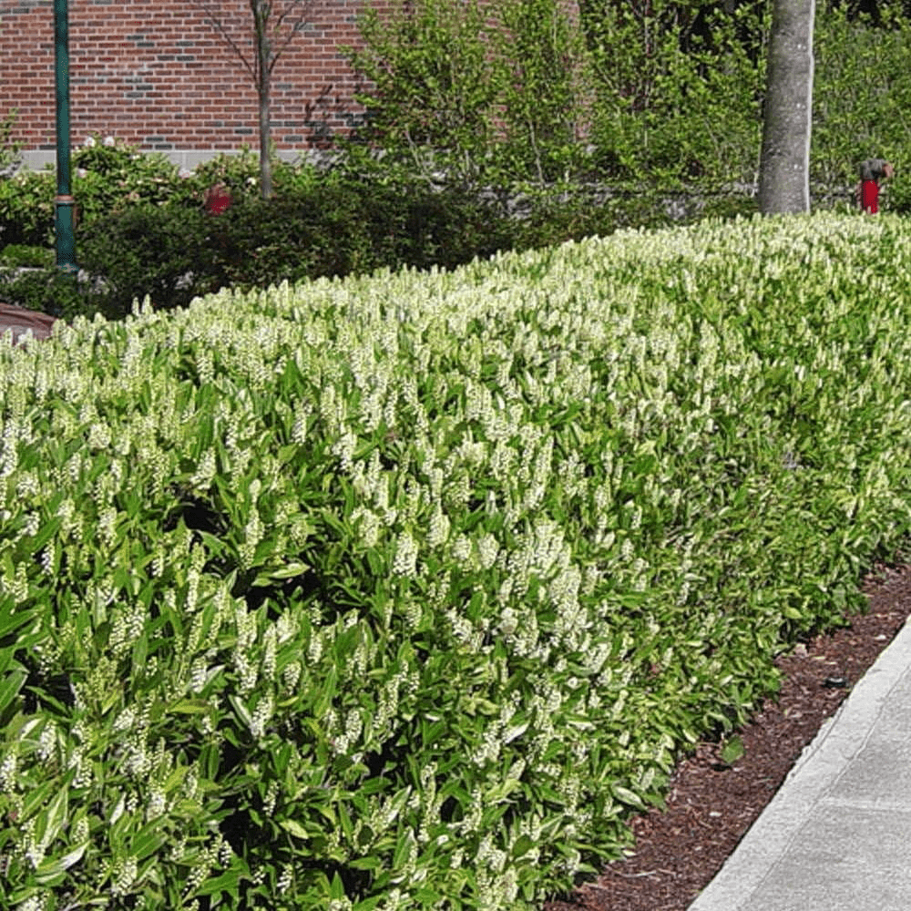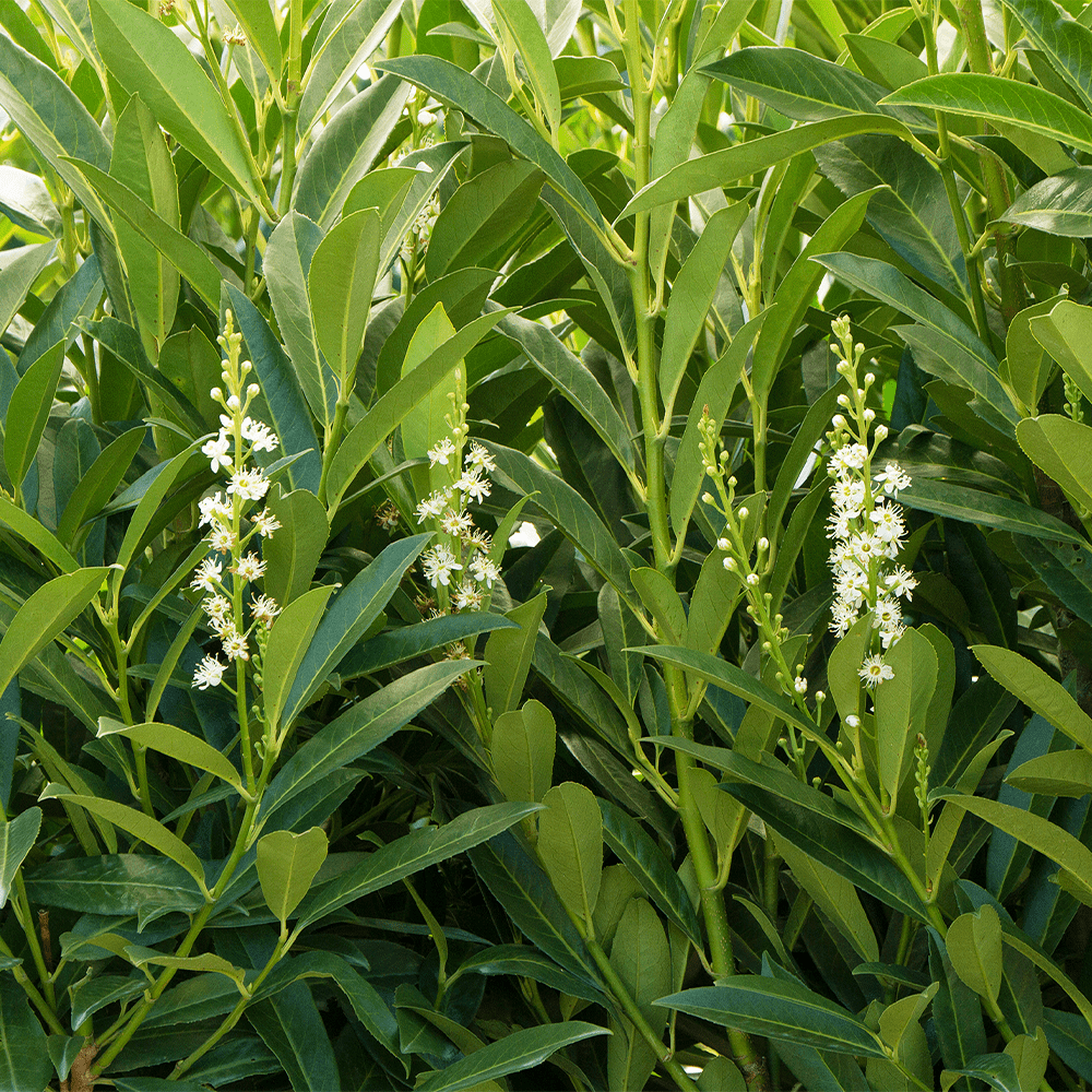 Skip Cherry Laurel is an easy to grow evergreen shrub or hedge plant for filtered sunlight to dappled shade. Glossy, medium-green leaves with a refined look on a solid, vase-shaped form create a layered effect. Stalks of fragrant white flowers appear in spring. Schip is one of the hardiest of the Laurels. It makes a stunning hedge or accent plant that responds to pruning very well. This shrub is often called Schip Laurel or Cherry Laurel. Often Confused with the True English Laurel.