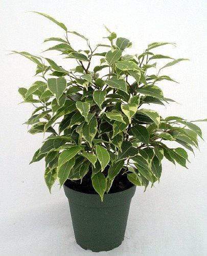 Variegated Ficus benjamina Plants are one of the most common houseplants. The green and cream-colored leaves add color to your decor. They can be trained as a tree with a clear trunk or as a bush with leaves from the top of the plant to the soil level. These plants need bright, direct light and they prefer to dry out some between watering. It's best to keep this Variegated Ficus benjamina in the same location because any change in moisture, light or location will cause the plant to drop some of its leaves to adjust. New leaves will quickly grow in to fill the tree.